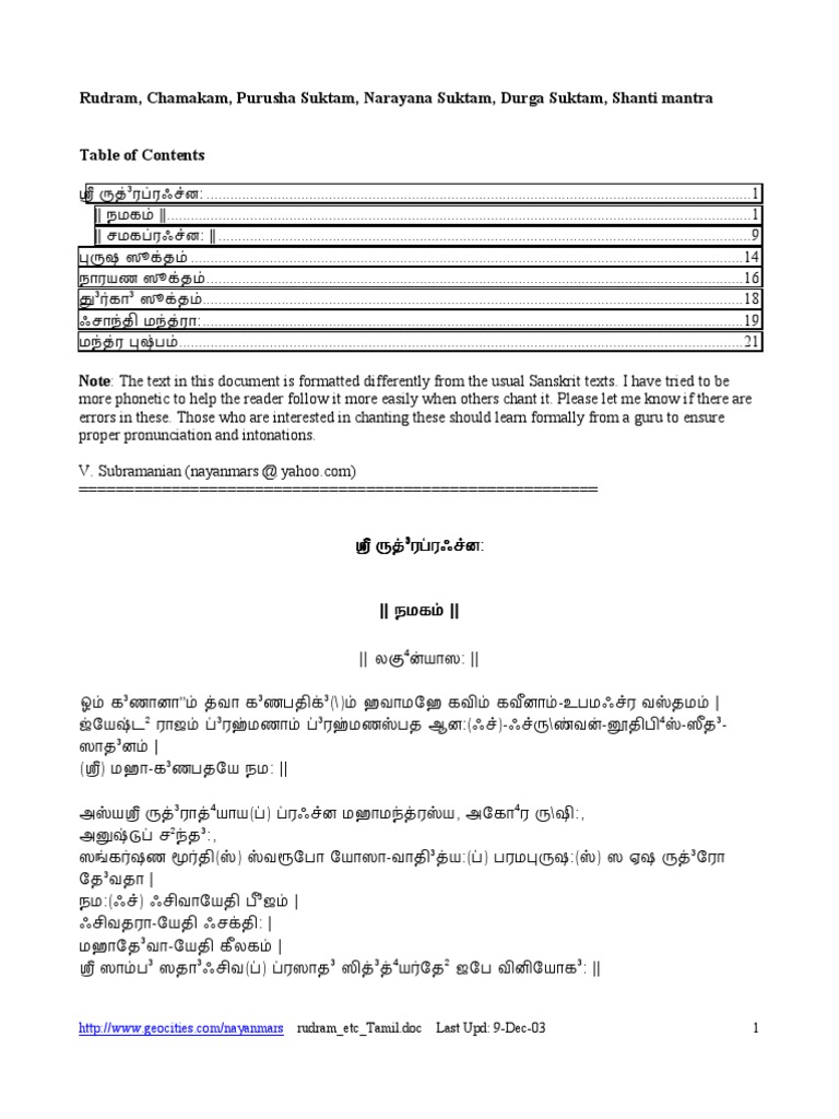 Sri Rudram Chamakam Purusha Suktam Narayana Suktam Durga Suktam Shanti Mantra In Tamil Pdf Hindu Texts Hymns