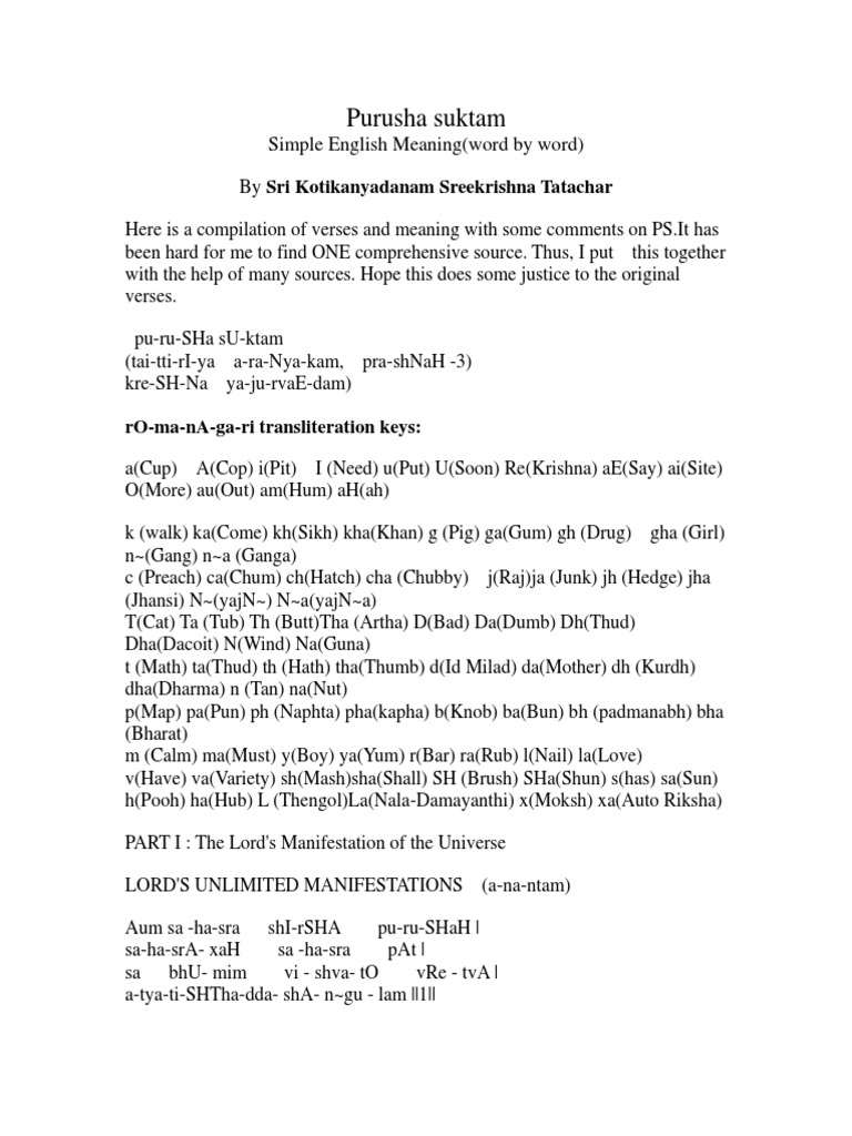 Purusha Suktam Detailed Word By Word Meaning Pdf Creator Deity Brahman